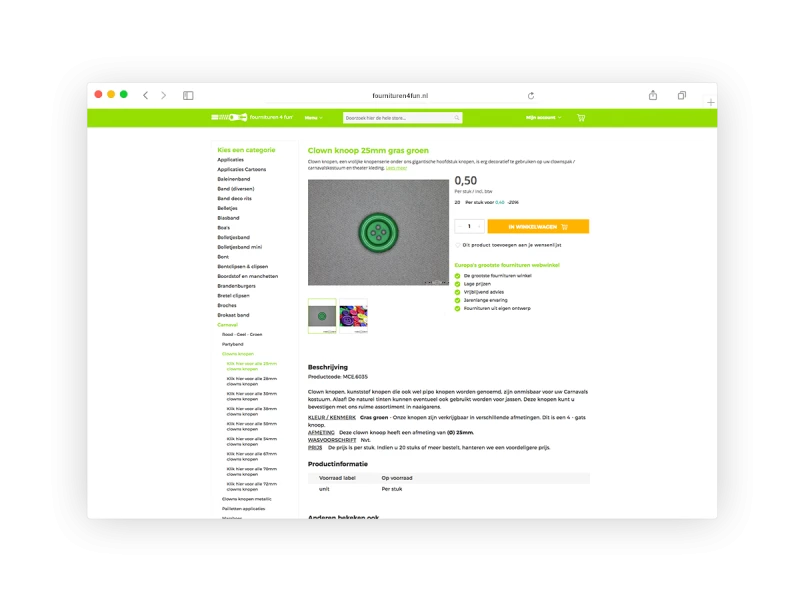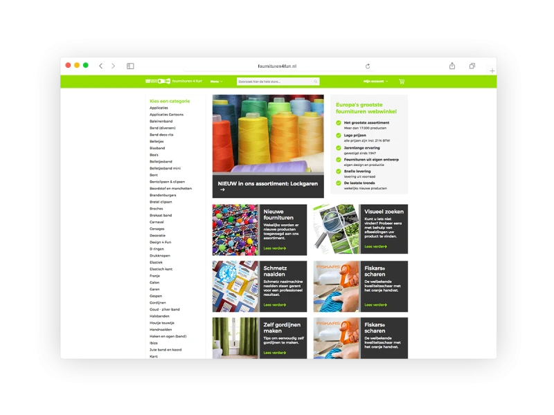 High-end Magento b2c webshopVanaf 1947 levert Fournituren4fun een ruim assortiment aan fournituren. Drukknopen, belletjes, elastiek, garen en nog veel meer. Meer dan 20.000 producten voor carnaval, kleding, dansgroepen en themafeesten. Wekelijks worden nieuwe producten op de webshop gezet die elk uit eigen voorraad geleverd worden. Zo kan elke bestelling zo snel mogelijk bij de klant thuisbezorgt worden.